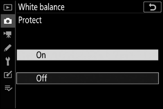 За да защитите текущата предварителна настройка за баланс на бялото, изберете [ ] в менюто за предварително зададен ръчен баланс на бялото. Маркирайте [ ] и натиснете J ; текущата предварителна настройка за баланс на бялото вече е защитена. Защитените предварително зададени настройки не могат да бъдат променяни.