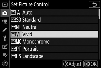 Маркирайте желания Picture Control в списъка Picture Control и натиснете 2 .