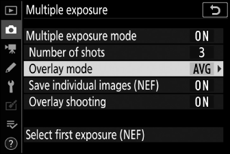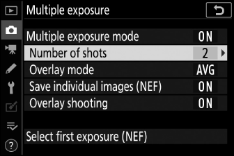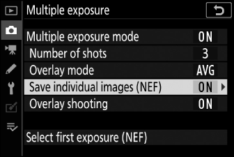 За да запазите както множествената експозиция, така и кадрите, които я съставят, изберете [ .]; отделните снимки се записват във формат NEF (RAW). За да запазите само многократната експозиция, изберете [ ].