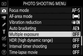 Ако използвате менютата или преглеждате снимки на дисплея, докато снимате многократна експозиция, не забравяйте, че снимането ще приключи и многократната експозиция ще бъде записана, ако не се извършват никакви операции в продължение на около 40 секунди (или в случай на менюта, около 90 секунди) . Наличното време за запис на следващата експозиция може да бъде удължено, като изберете по-дълги времена за персонализирана настройка c3 [ ] > [ ] или [ ].