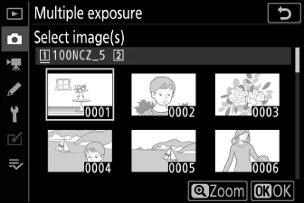 За да изберете първата експозиция от съществуващи NEF (RAW) снимки, маркирайте [ ] и натиснете 2 .