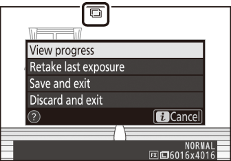 Направете избрания брой снимки. Ако сте използвали [ ], за да изберете съществуващо NEF (RAW) изображение като първа експозиция в стъпка 7, снимането ще започне от втората експозиция.