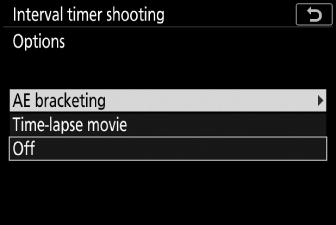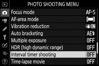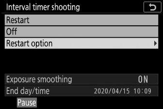 За да прекратите снимането с интервален таймер, преди да бъдат направени всички снимки, изберете [ ] в менюто за снимки, маркирайте [ ] и натиснете J . Имайте предвид, че менютата може да не се показват при натискане на бутона G , ако избраното време за [ ] е много кратко. В този случай ще трябва да натиснете J , за да поставите на пауза фотографията с интервален таймер и след това да изберете [ ] в менюто за снимане, маркирайте [ ] и натиснете J .
