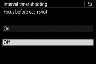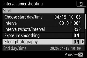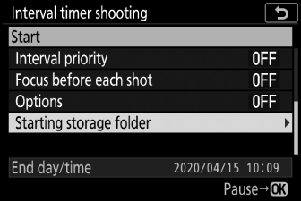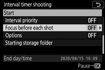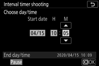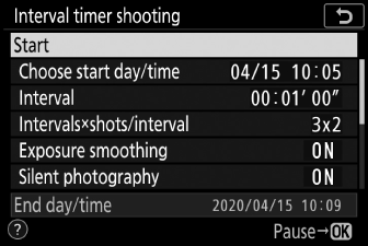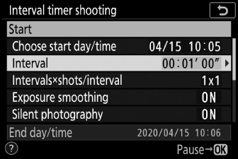 Снимката с интервален таймер може да бъде поставена на пауза между интервалите, като натиснете J или като изберете [ ] в менюто за снимки, маркирате [ ] и натиснете J . Имайте предвид, че менютата може да не се показват при натискане на бутона G , ако избраното време за [ ] е много кратко.