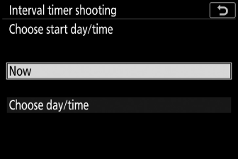 Започнете снимане с интервален таймер. Заснемането ще започне или след 3 s ([ ] избран за [ ]), или на избрана дата и час ([ ]). Снимането ще продължи през избрания интервал, докато не бъдат направени всички кадри. |