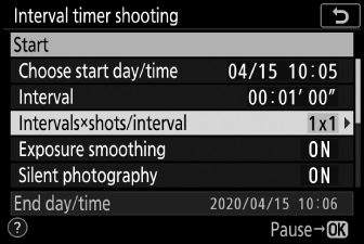 Изберете интервал, по-дълъг от времето, необходимо за заснемане на избрания брой снимки при предвидената скорост на затвора. Имайте предвид, че по време на действително снимане с интервален таймер, фотоапаратът трябва не само да прави снимки през избрания интервал, но също така трябва да има достатъчно време, за да завърши експозициите и да изпълни такива задачи като обработка на снимките. Ако интервалът е твърде кратък, за да направи избрания брой снимки, фотоапаратът може да прескочи към следващия интервал без да снима.