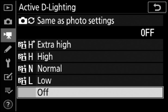 Имайте предвид, че ако [ Same as photo settings ] е избрано за Active D-Lighting в менюто за снимане на филми и [ Auto ] е избрано в менюто за снимане на снимки, филмите ще се заснемат при настройка, еквивалентна на [ Normal ].