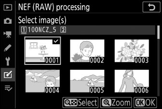 NEF (RAW) обработката е налична само с NEF (RAW) изображения, създадени с този фотоапарат. Не могат да бъдат избрани снимки в други формати и NEF (RAW) снимки, направени с други камери или Camera Control Pro 2.