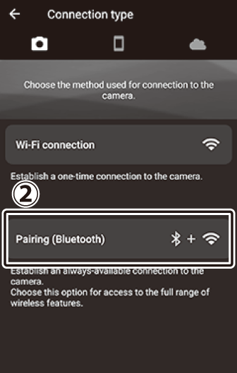 Използвайте приложението SnapBridge за безжични връзки между камерата и вашето смарт устройство. Можете да се свържете чрез Wi-Fi ( Свързване чрез Wi-Fi (Wi-Fi режим) ) или Bluetooth ( Свързване чрез Bluetooth ). Свързването чрез приложението SnapBridge ви позволява да настроите часовника на камерата и да актуализирате данните за местоположението, като използвате информацията, предоставена от смарт устройството. Свързването чрез Bluetooth позволява снимките да се качват автоматично при заснемане.