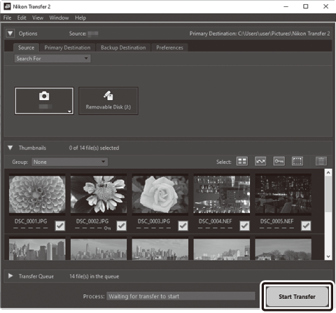 Компонентът Nikon Transfer 2 на NX Studio ще стартира. Софтуерът за прехвърляне на изображения Nikon Transfer 2 е инсталиран като част от NX Studio.