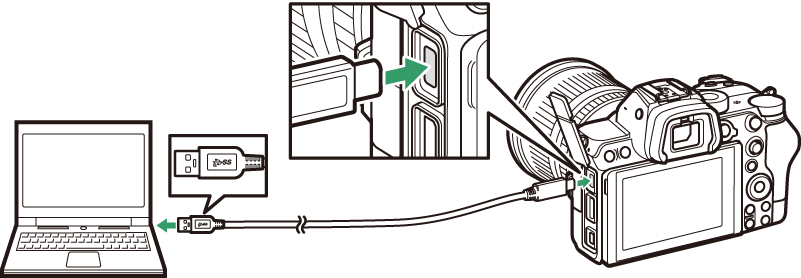 Свържете камерата с помощта на предоставения USB кабел. След това можете да използвате софтуера Nikon NX Studio, за да копирате снимки на компютъра за преглед и редактиране. За информация относно установяване на безжични връзки към компютри вижте „Свързване към компютри чрез Wi-Fi“ ( Свързване към компютри чрез Wi-Fi ) в „Установяване на безжични връзки към компютри или смарт устройства“.