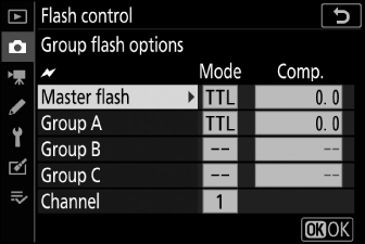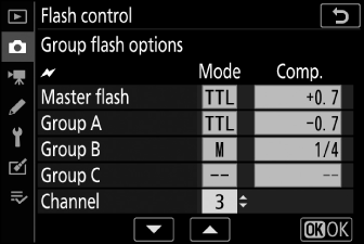 Регулирайте компенсацията на светкавицата за групи A и B.