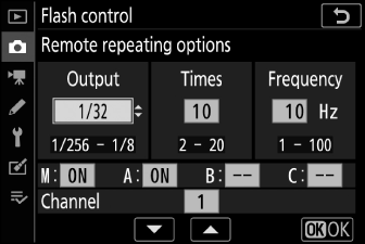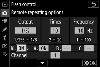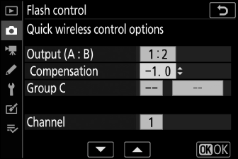 Изберете този елемент, за да контролирате относителния баланс между отдалечените светкавици в групи A и B и да регулирате мощността на светкавицата за група C. Изходът за група C се регулира ръчно.
