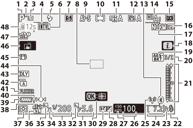 Индикатор за интервален таймер (Заснемане с интервален таймер ) икона t ( Иконата t ) Индикатор „Няма карта с памет“ ( Поставяне на карти с памет , Няма поставена карта с памет ) |