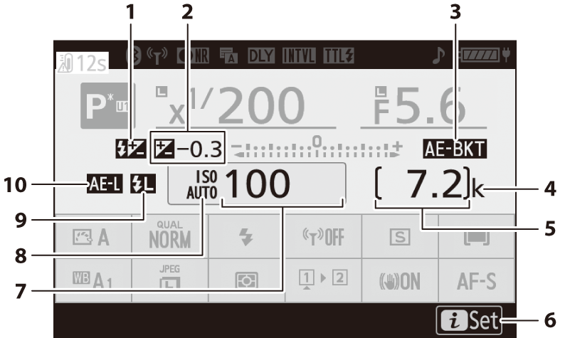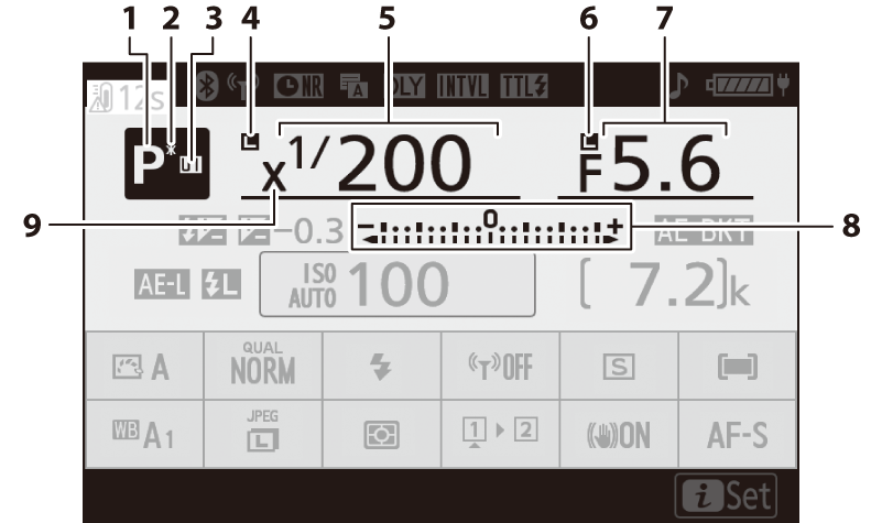 Индикатор за експозиция Експозиция ( Индикатори за експозиция ) Компенсация на експозицията ( Бутонът E (Компенсация на експозицията) ) Брекетинг на експозиция и светкавица ( Експозиция и брекетинг на светкавицата ) WB брекетинг ( Брекетинг на баланса на бялото) ADL скоби ( ADL скоби ) |