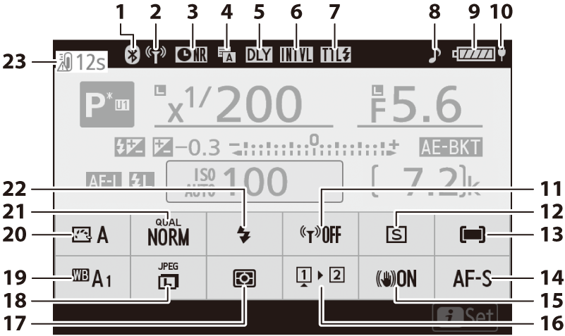 Индикатор за експониране и скоби на светкавица ( Експозиция и бракетинг на светкавицата ) Индикатор за балансиране на белия цвят ( брекетинг на белия баланс ) Индикатор за ADL скоби ( ADL Bracketing ) HDR индикатор ( правене на HDR снимки ) Индикатор за множествена експозиция ( Създаване на множествена експозиция ) |