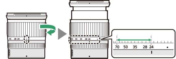 Обективът е прибиращ се и трябва да бъде удължен преди употреба. Завъртете пръстена за мащабиране, както е показано, докато обективът щракне в разгънато положение. Снимките могат да се правят само когато маркировката за фокусно разстояние сочи към позиции между 24 и 70 в скалата на фокусното разстояние.
