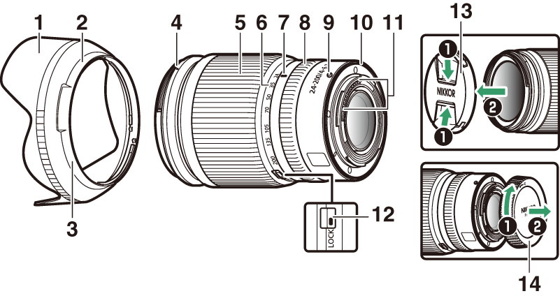 Частите на NIKKOR Z 24–200 mm f/4–6.3 VR са изброени по-долу.