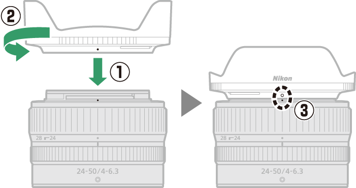 Когато поставяте или премахвате сенника, дръжте го близо до маркировката за подравняване на сенника на обектива ( I ) и избягвайте да хващате предната част на сенника твърде здраво. Сенникът може да се обърне и да се монтира върху обектива, когато не се използва.