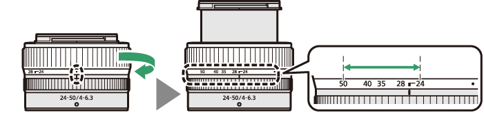 Обективът е прибиращ се и трябва да бъде удължен преди употреба. Завъртете пръстена за мащабиране, както е показано, докато обективът щракне в разгънато положение. Снимките могат да се правят само когато маркировката за фокусно разстояние сочи към позиции между 24 и 50 в скалата на фокусното разстояние.