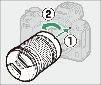 Richten Sie den weißen Punkt auf dem Objektiv mit dem weißen Punkt auf dem Kameragehäuse ( q ) aus und drehen Sie das Objektiv in die gezeigte Richtung ( w ).