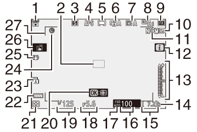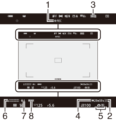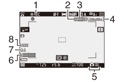 Bei den Standardeinstellungen erscheinen die folgenden Anzeigen auf dem Monitor und im Sucher; Eine vollständige Liste der Anzeigen finden Sie unter „Kameraanzeigen“ ( Kameraanzeigen ) in „Technische Hinweise“.