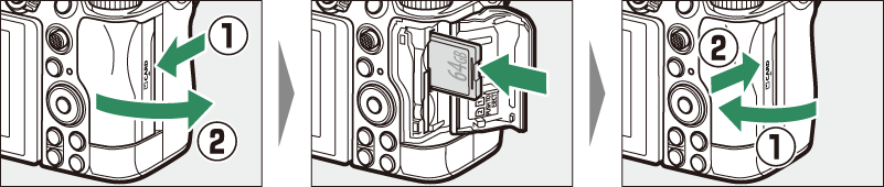 Nachdem Sie sich vergewissert haben, dass die Speicherkarten-Zugriffslampe erloschen ist, schalten Sie die Kamera aus, öffnen Sie die Abdeckung des Speicherkartensteckplatzes und drücken Sie die Karte hinein, um sie auszuwerfen ( q ). Die Karte kann dann von Hand entfernt werden ( w ).