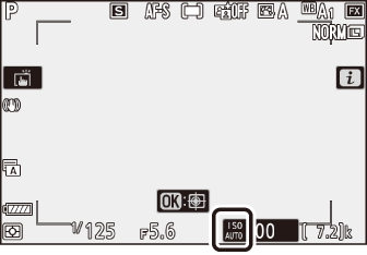Wenn die automatische ISO-Empfindlichkeitssteuerung aktiviert ist, zeigt die Aufnahmeanzeige ISO AUTO . Wenn die Empfindlichkeit von dem vom Benutzer ausgewählten Wert geändert wird, wird die ISO-Empfindlichkeit in den Displays angezeigt.