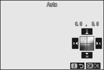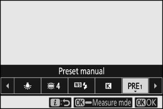 Voreinstellungen für den Weißabgleich können angezeigt werden, indem Sie im Fotoaufnahmemenü [ ] > L [ ] auswählen. Um einen gespeicherten Wert abzurufen, markieren Sie mit dem Multifunktionswähler eine Voreinstellung und drücken J .