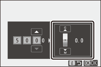 Drücken Sie 1 oder 3 , um Einstellungen zu markieren. Drücken Sie 4 oder 2 , um einen Wert in Schritten von 1 auszuwählen, oder drehen Sie das vordere Einstellrad, um einen Wert in Schritten von 0,25 auszuwählen.