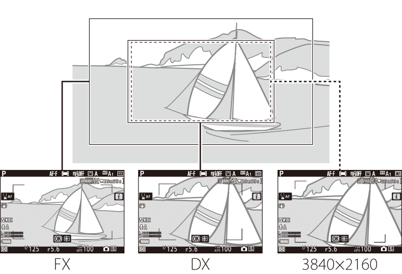 Wählen Sie einen Filmausschnitt aus [ ] und [ ]. Wählen Sie [ ], um Filme im sogenannten „FX-basierten Filmformat“ aufzunehmen, [ ], um im „DX-basierten Filmformat“ aufzunehmen. Der Filmausschnitt ist auf 1,7× bei einer Bildgröße von 3840 × 2160 festgelegt. Die Unterschiede sind unten dargestellt.