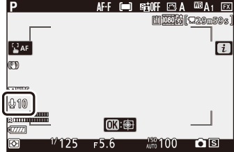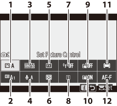 Wenn [ ] für [ - Konfiguration ] , [ ] , [ ] oder [ ] im Filmaufnahmemenü ausgewählt ist, wird ein h -Symbol in der oberen linken Ecke von angezeigt das i -Menü. Änderungen, die im Fotomodus über das Menü i vorgenommen werden, gelten auch für den Filmmodus und umgekehrt .