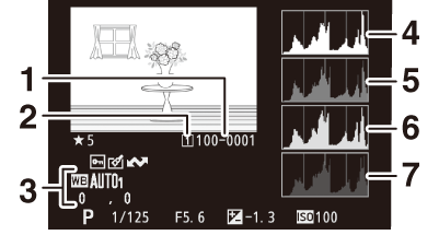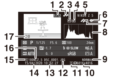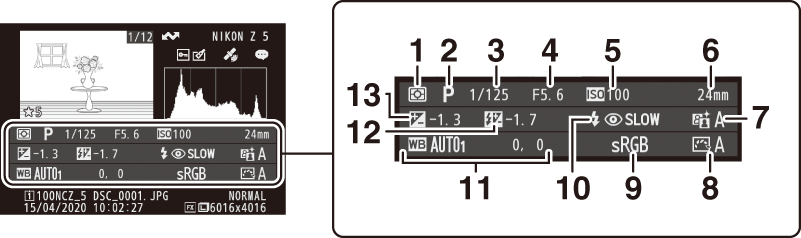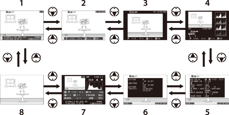 Bildinformationen werden in die Bilder eingeblendet, die in der Einzelbildwiedergabe angezeigt werden. Drücken Sie 1 , 3 oder die DISP -Taste, um wie unten gezeigt durch die Fotoinformationen zu blättern.