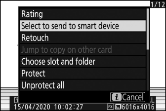 Durch Drücken der i -Taste während des Wiedergabezooms oder der Einzelbild- oder Miniaturbildwiedergabe wird das i -Menü für den Wiedergabemodus angezeigt. Markieren Sie Elemente und drücken Sie J oder 2 , um sie auszuwählen.