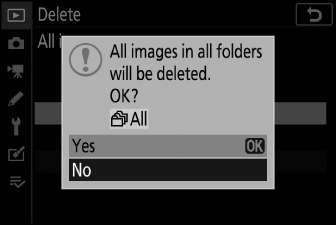 Ein Bestätigungsdialogfeld mit dem Namen des Ordners mit den zu löschenden Fotos wird angezeigt. Markieren Sie [ ] und drücken J , um alle Bilder aus dem Ordner zu löschen. Der Ordner ist der zuvor über [ ] im Wiedergabemenü ausgewählte.