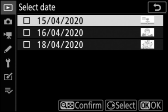 Während der Kalenderwiedergabe können Sie alle an einem ausgewählten Datum aufgenommenen Fotos löschen, indem Sie das Datum in der Datumsliste markieren und die O -Taste drücken.