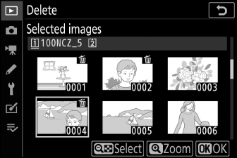 Markieren Sie Bilder mit dem Multifunktionswähler und drücken Sie zur Auswahl die W ( Q )-Taste; Ausgewählte Bilder sind mit O -Symbolen gekennzeichnet. Ausgewählte Bilder können durch erneutes Drücken der Taste W ( Q ) deselektiert werden.