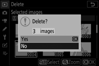 Wenn das beim Drücken der O -Taste in der Wiedergabeanzeige ausgewählte Bild mit zwei eingesetzten Speicherkarten aufgenommen wurde und [ ] oder [ ] für [ ] ausgewählt wurde, werden Sie es sein aufgefordert, auszuwählen, ob beide Kopien oder nur die Kopie auf der Karte im aktuellen Steckplatz gelöscht werden sollen ( Löschen von Kopien ).