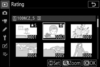 • Drücken Sie 1 oder 3 , um eine Bewertung zwischen null und fünf Sternen auszuwählen, oder wählen Sie d , um das Bild als Kandidat für eine spätere Löschung zu markieren.