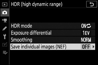Wählen Sie [ ], um jede einzelne Aufnahme zu speichern, die zum Erstellen des HDR-Bildes verwendet wurde; Die Aufnahmen werden im NEF-Format (RAW) gespeichert.
