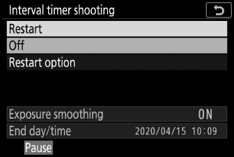 Die Intervallaufnahme kann zwischen den Intervallen angehalten werden, indem Sie J drücken oder im Fotoaufnahmemenü [ ] auswählen, [ ] markieren und J drücken. Beachten Sie, dass die Menüs möglicherweise nicht angezeigt werden, wenn die G -Taste gedrückt wird, wenn die für [ ] gewählte Zeit sehr kurz ist.