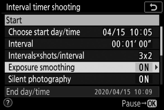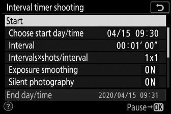 Wählen Sie ein längeres Intervall als für die Aufnahme der ausgewählten Anzahl von Aufnahmen mit der vorhergesagten Verschlusszeit erforderlich ist. Beachten Sie, dass die Kamera während der eigentlichen Intervall-Timer-Fotografie nicht nur Aufnahmen im ausgewählten Intervall machen muss, sondern auch genügend Zeit haben muss, um die Belichtungen abzuschließen und Aufgaben wie die Verarbeitung der Fotos durchzuführen. Wenn das Intervall zu kurz ist, um die ausgewählte Anzahl von Fotos aufzunehmen, springt die Kamera möglicherweise ohne Aufnahme zum nächsten Intervall.