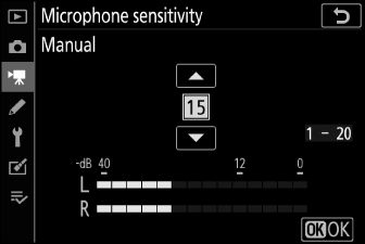 Stellen Sie die Mikrofonempfindlichkeit manuell ein. Wählen Sie aus Werten von [ 1 ] bis [ 20 ]. Je höher der Wert, desto höher die Empfindlichkeit; Je niedriger der Wert, desto niedriger die Empfindlichkeit.