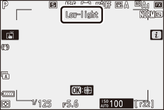 • Während Low-Light-AF aktiv ist, erscheint „Low-light“ auf dem Display. Die Anzeigeaktualisierungsrate kann sinken.