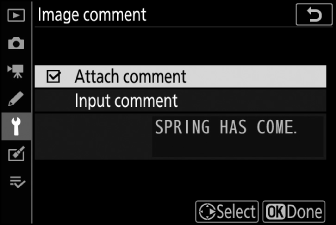 Um den Kommentar an nachfolgende Fotos anzuhängen, markieren Sie [ anhängen ], drücken Sie 2 und bestätigen Sie, dass ein Häkchen ( M ) im angrenzenden Kontrollkästchen erscheint. Drücken J , um die Änderungen zu speichern und zu beenden; Der Kommentar wird an alle nachfolgenden Fotos angehängt.