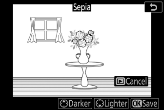 • Bei [ Sepia ] oder [ Cyanotype ] kann die Farbsättigung mit dem Multifunktionswähler angepasst werden. Drücken Sie 1 zum Erhöhen, 3 zum Verringern. Die Änderungen werden in der Vorschau wiedergegeben.