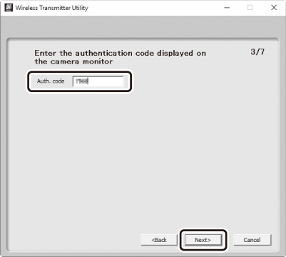 Geben Sie im Wireless Transmitter Utility den von der Kamera angezeigten Authentifizierungscode ein.