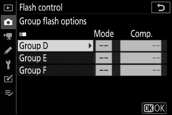 Die Slave-Blitzgeräte können in bis zu sechs Gruppen (A bis F) platziert werden. Platzieren Sie optisch gesteuerte Einheiten in den Gruppen A bis C und funkgesteuerte Einheiten in den Gruppen D bis F. Um Optionen für die Gruppen D bis F anzuzeigen, drücken Sie 1 oder 3 in der Anzeige [ ].