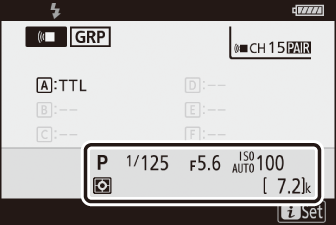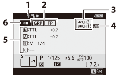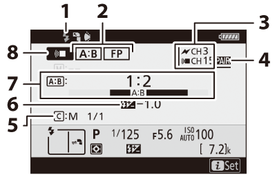 Die Kamera kann Blitzinformationen für ein SB-5000- oder SB-500-Blitzgerät anzeigen, das auf dem Zubehörschuh der Kamera montiert und als Master-Blitzgerät für optisches AWL konfiguriert ist, sowie für ferngesteuerte Blitzgeräte, die über Funk AWL mit einem WR-R10 gesteuert werden. Um Blitzinformationen anzuzeigen, drücken Sie die DISP- Taste im Fotomodus ( Die DISP- Taste ).