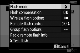 Die Blitzeinstellungen können durch Drücken der i -Taste in der Blitzinfoanzeige geändert werden. Die verfügbaren Optionen variieren je nach Blitzgerät und gewählten Einstellungen. Sie können den Blitz auch probeweise auslösen.